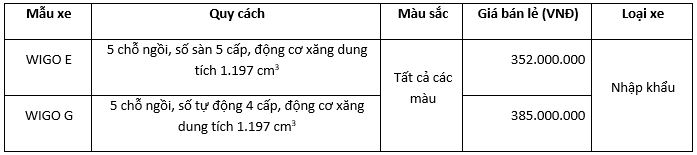 Toyota Wigo được phân phối với mức giá bán lẻ mới như sau: