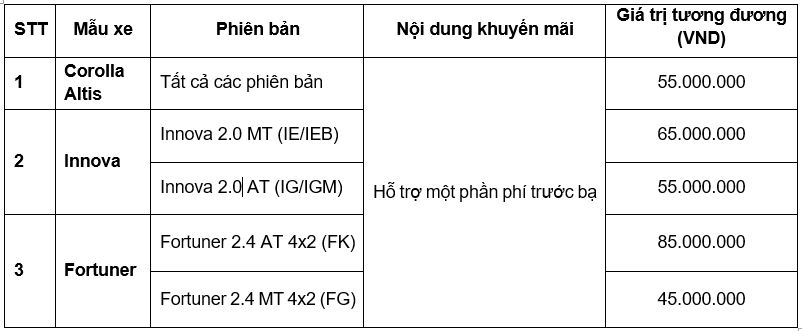 TMV cùng hệ thống đại lý Toyota áp dụng ưu đãi cho khách hàng mua xe Corolla Altis (tất cả các phiên bản), Innova 2.0 MT (IE/IEB), Innova 2.0 AT (IG/IGM), Fortuner 2.4 AT 4x2 (FK), Fortuner 2.4 MT 4x2 (FG) và hoàn tất thủ tục thanh toán 100% giá trị xe tại các đại lý Toyota trên toàn quốc từ ngày 01/02 đến 29/02/2020 sẽ nhận được những ưu đãi sau:
