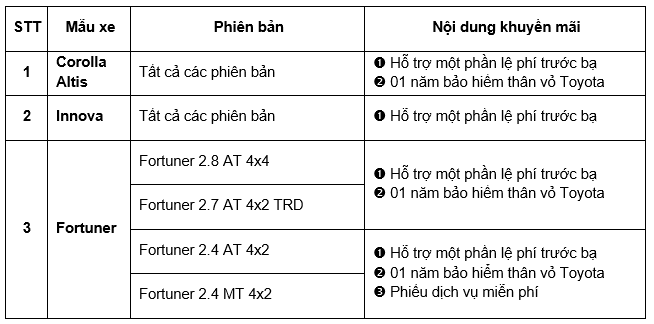 Theo đó, khách hàng mua xe Corolla Altis (tất cả các phiên bản), Innova (tất cả các phiên bản), Fortuner 2.8AT 4x4, Fortuner 2.7AT 4x2 TRD, Fortuner 2.4AT 4x2, Fortuner 2.4MT 4x2 và hoàn tất thủ tục thanh toán 100% giá trị xe tại các đại lý Toyota trên toàn quốc từ ngày 03/01 đến 31/01/2020 sẽ nhận được những ưu đãi sau: