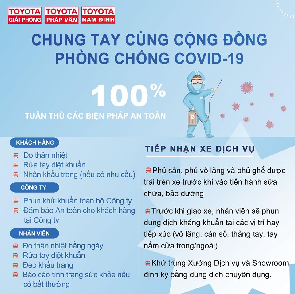 Toyota Giải Phóng và Toyota Pháp Vân bắt đầu hoạt động lại từ ngày 23/4/2020 và để đảm bảo an toàn sức khỏe, chúng ta sẽ cùng thực hiện các biện pháp nhỏ - ý nghĩa lớn: